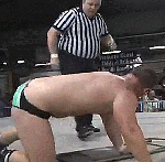 This beefy brawler was born April 9, 1983 (age 34) in Tampa, FL. In this series, he’s battling Bruiser Bradley, who pulls his trunks while cornered in the turnbuckle. Steve has no time to right his trunks through the remainder of the match (thankfully)